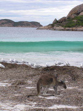 海岸に、野生のカンガルーが草をはみはみしてる!