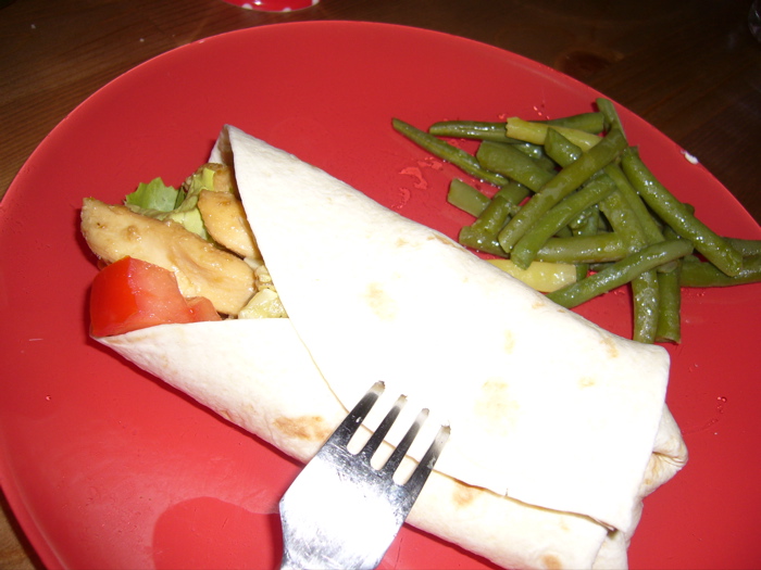 トルティーヤ生地に、野菜と鶏肉をくるくる巻いたラップです。